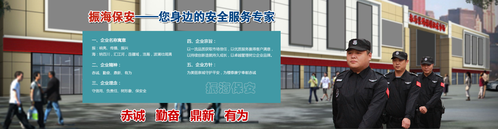 山東振海保安服務有限公司是一家專業(yè)的保安服務公司,提供人防安保、臨時勤務安保、危機處理安保、犬防安保、反跟蹤、調(diào)查、商業(yè)間諜等服務,公司成立于2015年5月,是通過國家公安部門資質認證,經(jīng)山東省公安廳和濟南市工商局批準成立的綜合性民營保安公司。公司立足濟南,面向山東省內(nèi)外,開展的業(yè)務涵蓋人防、技防、安檢、守護、隨身護衛(wèi)、大型活動特勤等安保項目。公司總部坐落于濟南市市中區(qū)英雄山立交樞紐南側振海裝飾材料市場大樓;公司培訓基地位于濟南市南部山區(qū)。